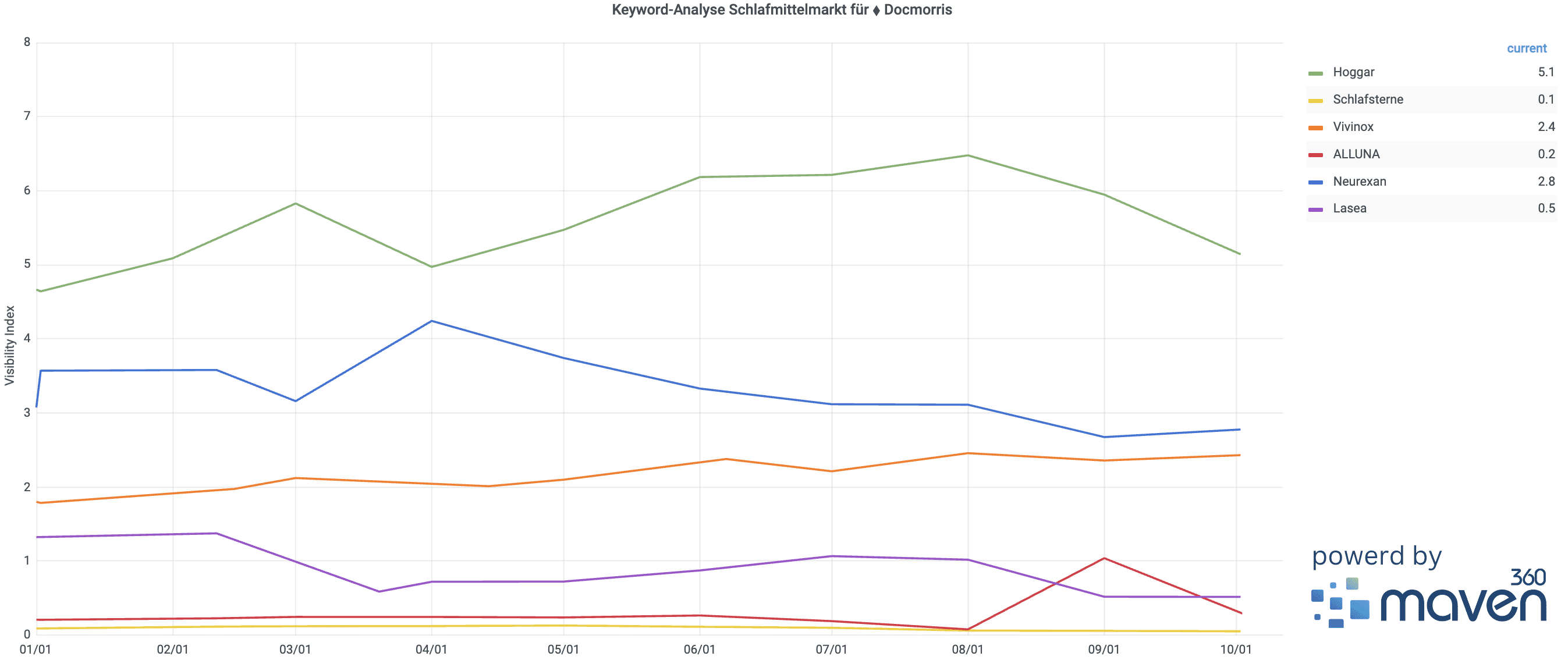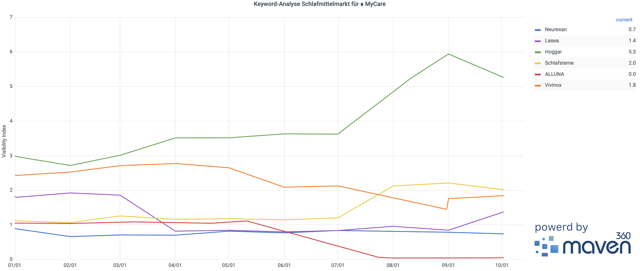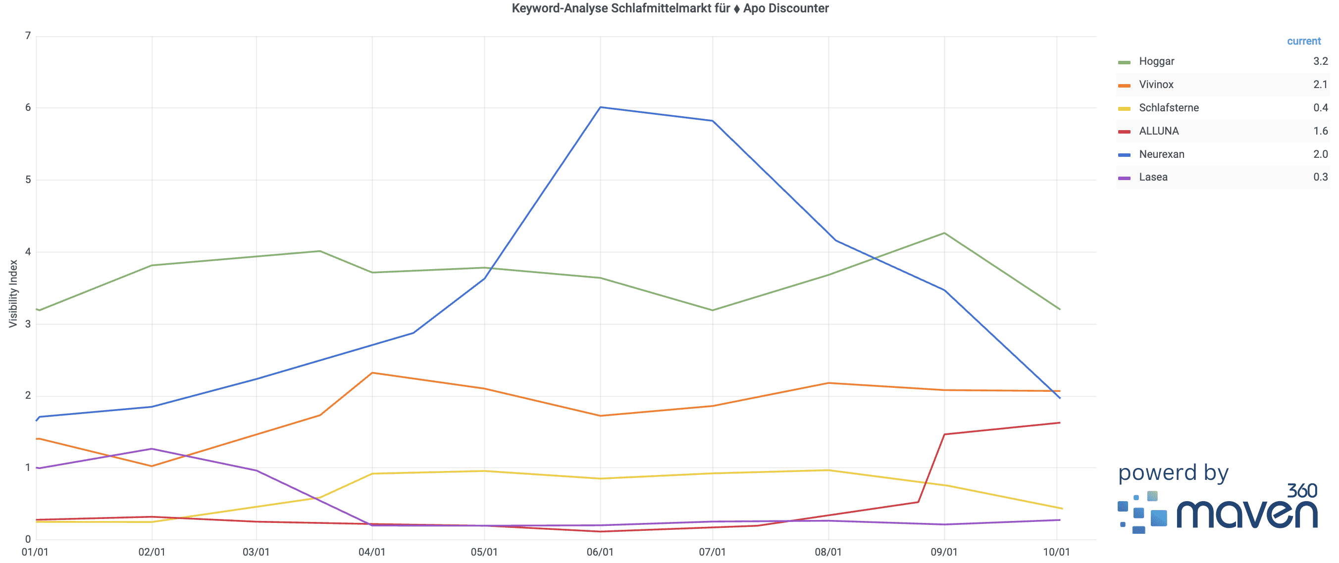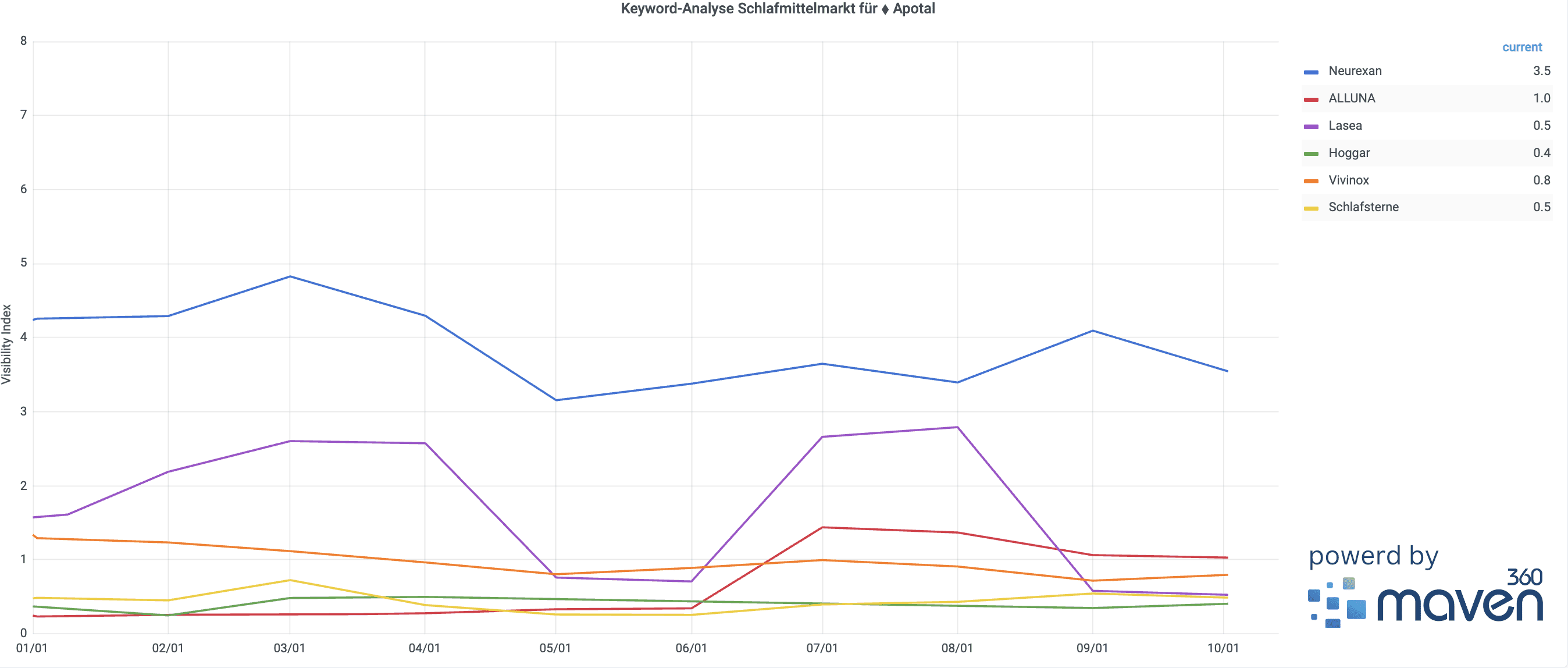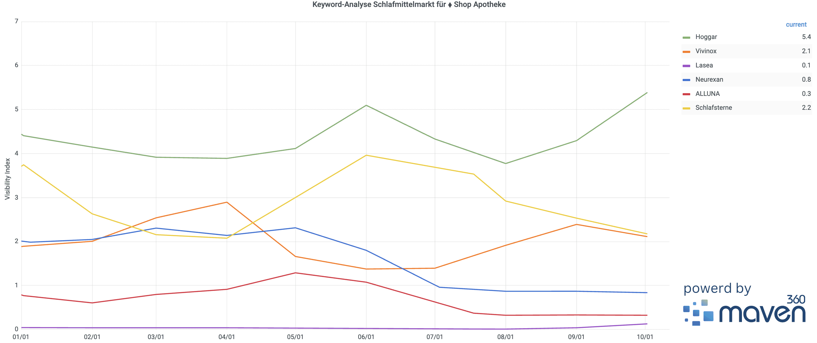 Die Grafiken veranschaulichen die Sichtbarkeit in Form unseres Index für die relevanten Keywords rund um das Thema Schlafmittel. Dabei haben wir unsere primären Versandapotheken Shop Apotheke, DocMorris, Medpex, Medikamente per Klick, Aponeo, Sanicare, mycare und Apotal gewählt.