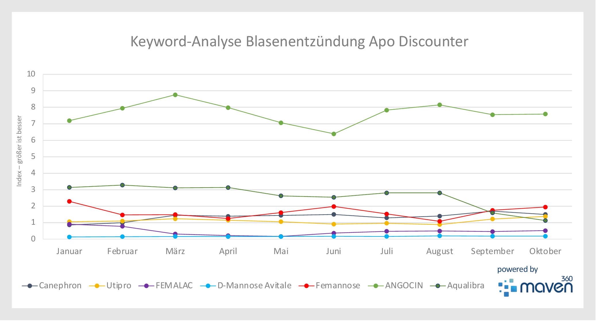 Während beispielsweise Angocin bei Apo Discounter einen durchschnittlichen Sichtbarkeitsindex von 7,4 hat, beträgt der Sichtbarkeitsindex des Präparates in der Shop Apotheke in demselben Zeitraum nur 1. Canephron hingegen hat bei Apotal einen Sichtbarkeitsindex von 7,6 und bei Sanicare von 0,6.
