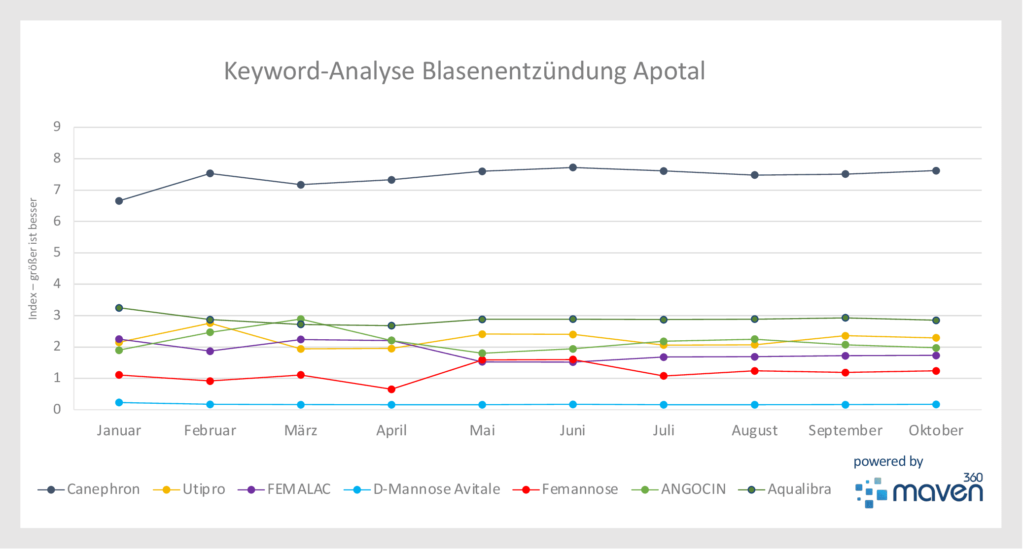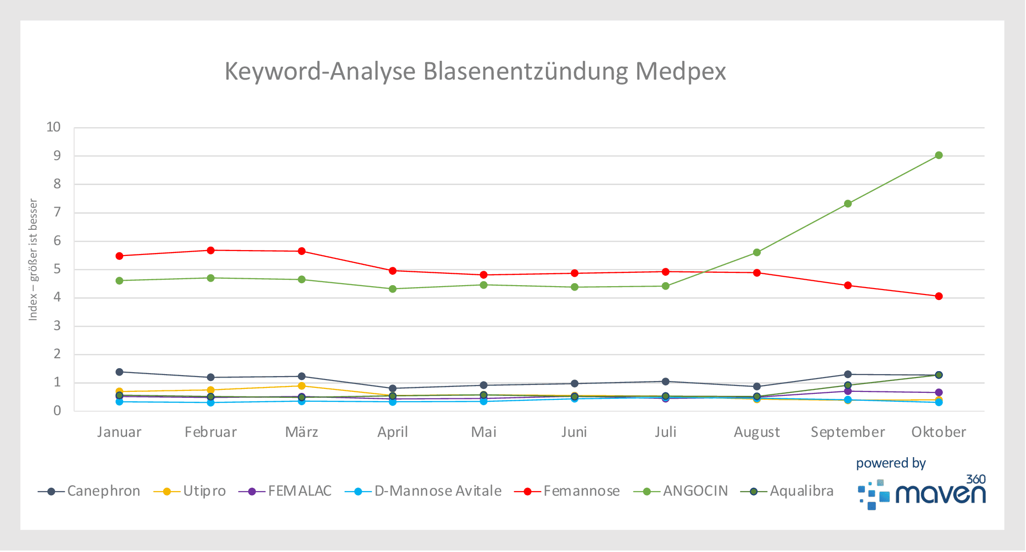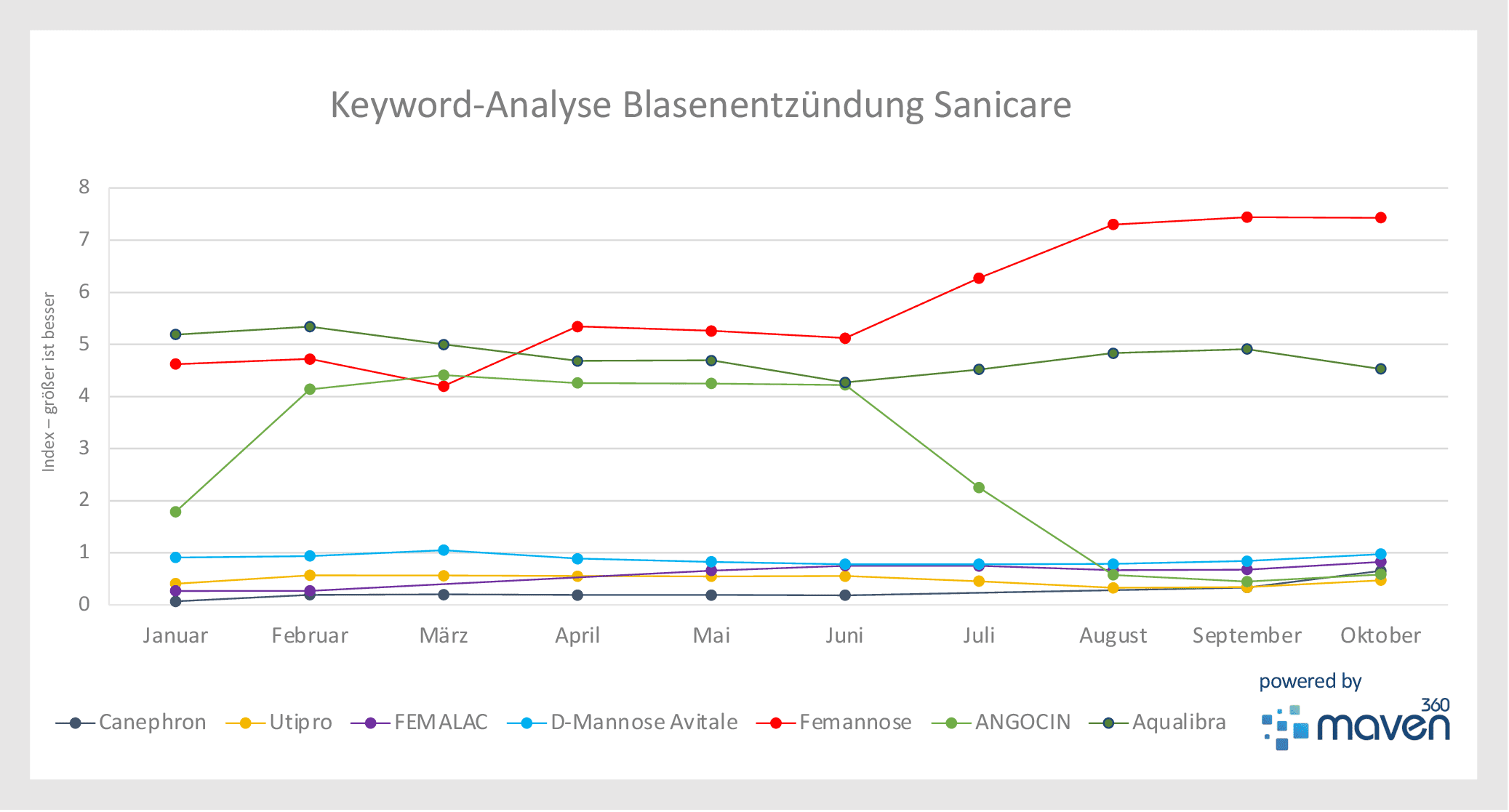 Blasenentzündungen und andere Harnwegsinfektionen treten plötzlich auf und sind sehr schmerzhaft. Der User Intent ist dringlich und das bedeutet: Betroffene neigen dazu, das erste überzeugende OTC-Präparat zu wählen, das sie in der Online-Apotheke sehen. Umso wichtiger ist es für OTC-Hersteller mit ihren Marken und Präparaten besser in den Versandapotheken zu ranken als die Konkurrenz.