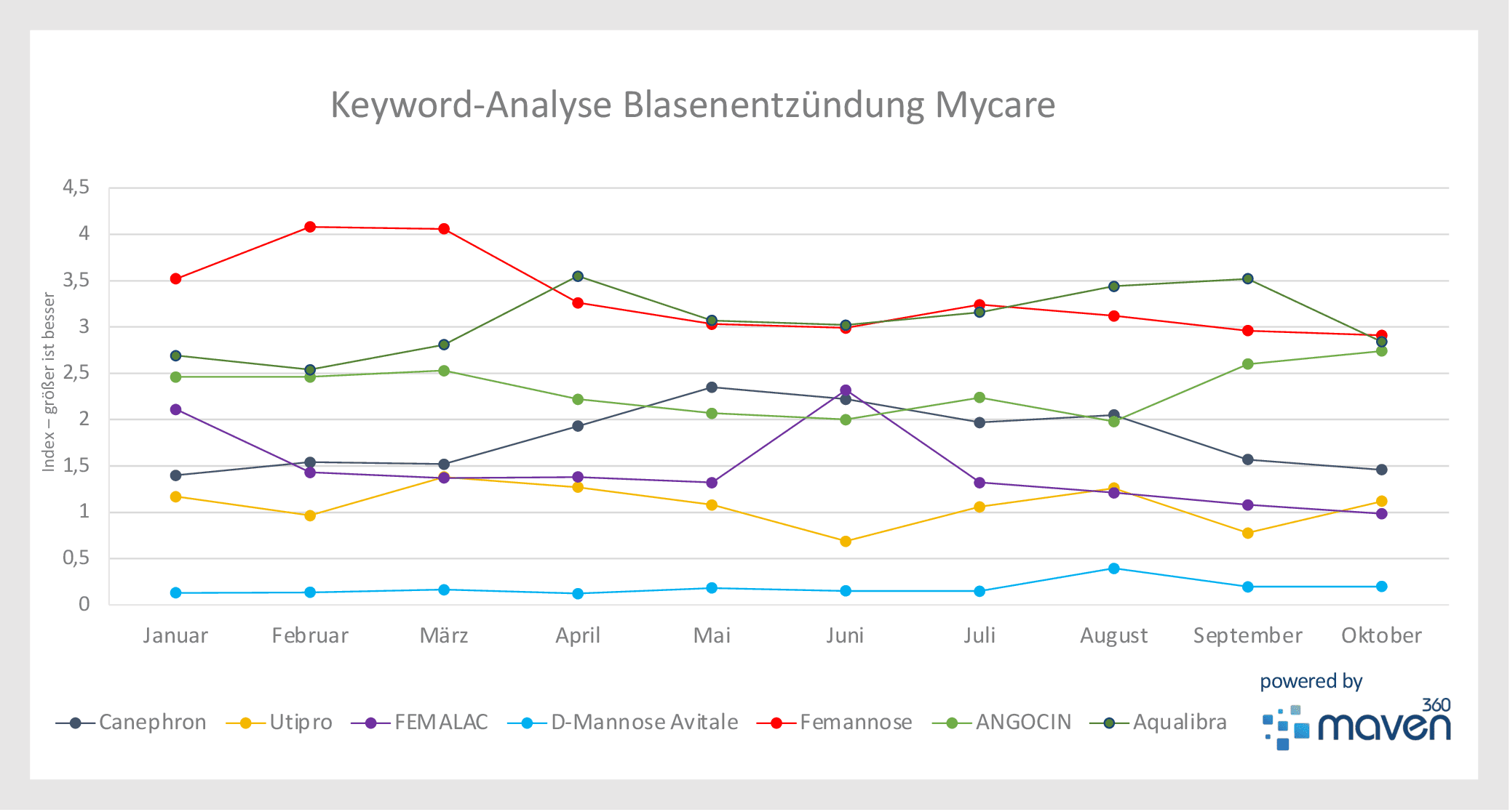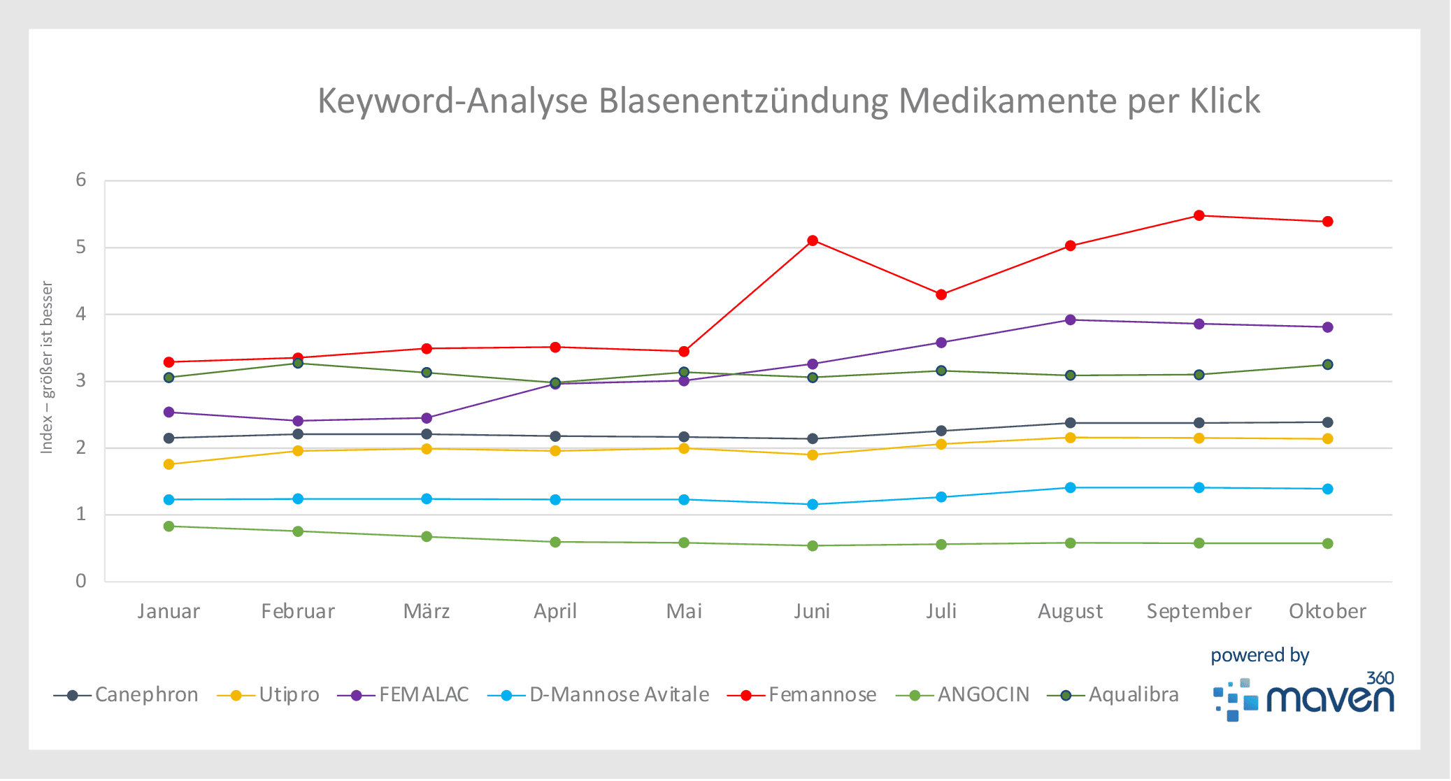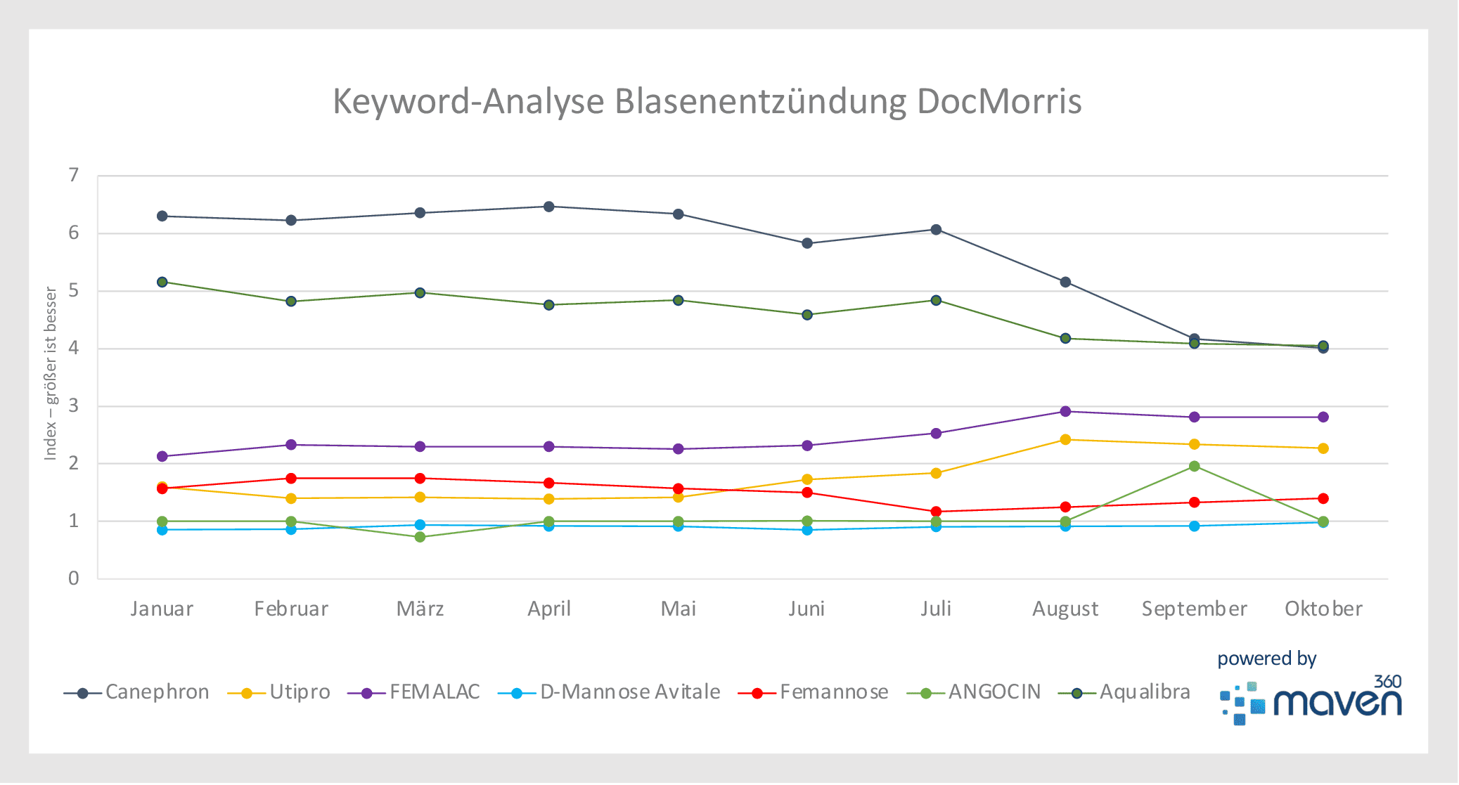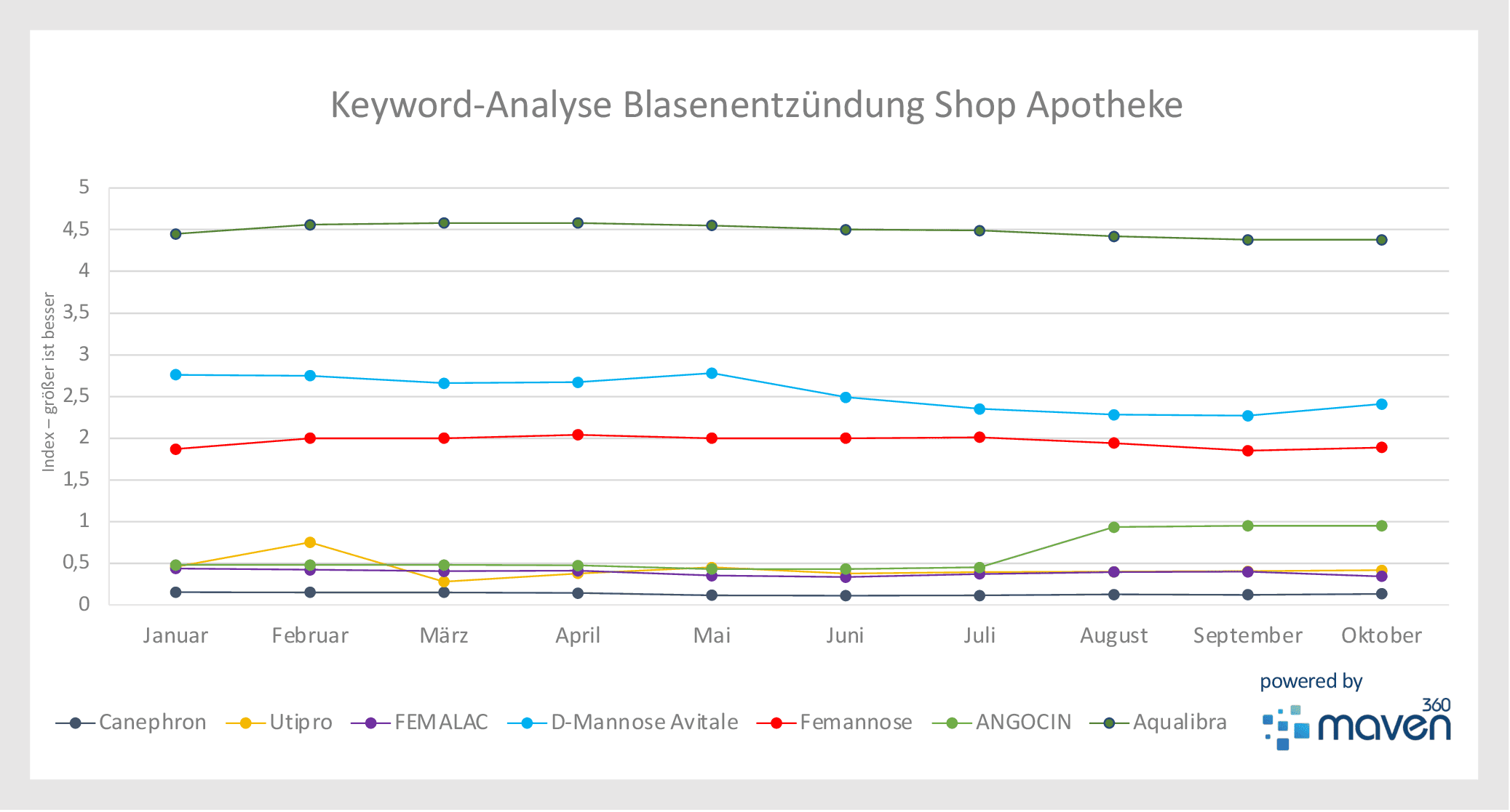 Blasenentzündungen und andere Harnwegsinfektionen treten plötzlich auf und sind sehr schmerzhaft. Der User Intent ist dringlich und das bedeutet: Betroffene neigen dazu, das erste überzeugende OTC-Präparat zu wählen, das sie in der Online-Apotheke sehen. Umso wichtiger ist es für OTC-Hersteller mit ihren Marken und Präparaten besser in den Versandapotheken zu ranken als die Konkurrenz.