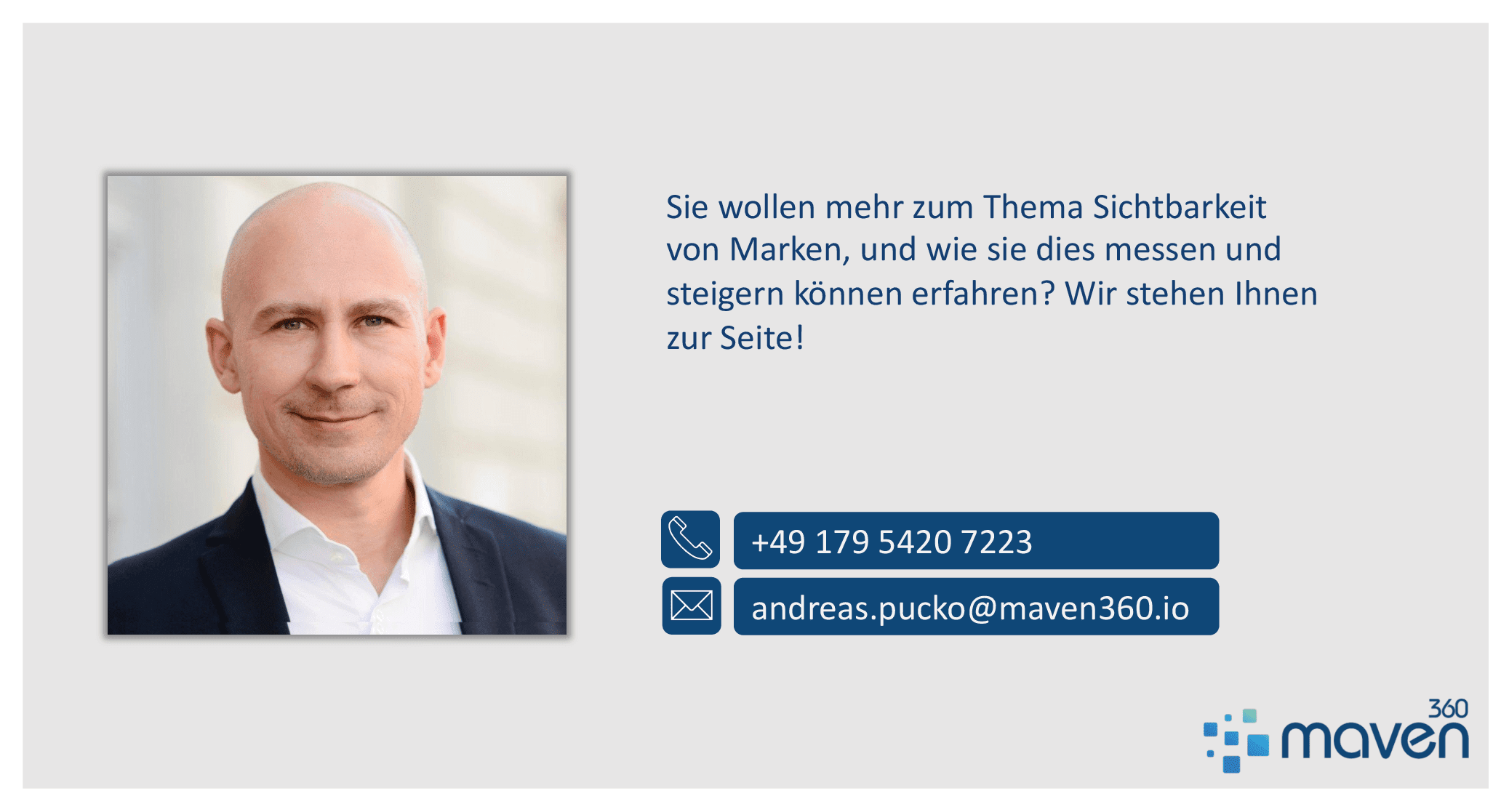 Dies ermöglicht es Ihnen einerseits Ihre eigenen Marketinganstrengungen zu überwachen, andererseits den Maßnahmen der Konkurrenz zu folgen. Melden Sie sich bei uns, wenn Sie dazu Fragen haben oder Maven360 näher kennenlernen möchten.